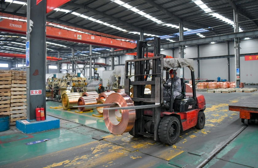 叉车搬运铜带产品。