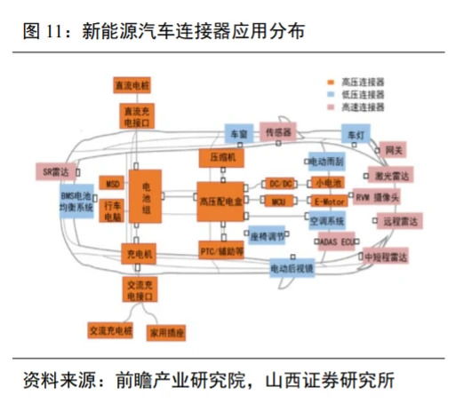 汽车连接器广泛应用于汽车的各个子系统中。传统燃油车单车所用连接器数量约为500个,而新能源汽车单车将运用800-1000个连接器,车载连接器数量需求翻番。汽车电动化、智能化、网联化趋势下,汽车电子应用将从中高端车型向低端车型渗透,在整车制造成本中的占比不断提高,在新能源整车中成本占比达到45%-65%。汽车连接器作为各个电子系统连接的信号枢纽,广泛应用于动力系统、车身系统、信息控制系统、安全系统、车载设备等方面。