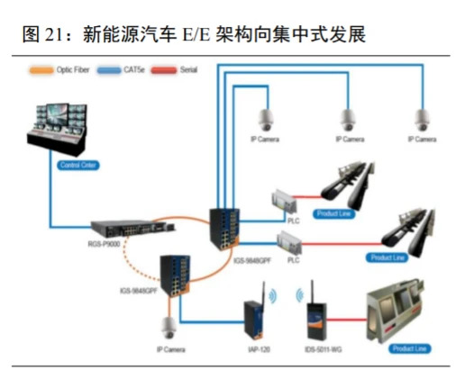 高速连接器向集中式逐步演变,出于安全考虑倾向于本土供应商。随着汽车电子化程度持续提高,整车E/E 架构由分布式向集中式逐步演变,叠加自动驾驶等智能化趋势驱动,汽车算力及数据传输速率要求显著提升,带来车载高速通信连接器增量需求,以自动驾驶辅助系统为例,自动驾驶级别为 L1 和 L2 需要安装的摄像头为3-5颗,L4-L5 基本在10-20颗,摄像头数量变多对应的高频高清传输连接器数量会相应增加;车企也将倾向于采用本土供应商,从而确保数据安全。高速连接器主要包括射频连接器(Fakra 连接器、 Mini Fakra 连接器、HSD 连接器)和以太网连接器,通常会组合使用以保证汽车不同的智能化需求。Fakra 连接器一般应用于传感器的安装连接;Mini Fakra 连接器因其良好的集成化性能,作为传感器数据与 AVM 系统的传输中介;HSD 连接器主要应用在 AVM 到主机端、主机端到座舱的高速传输;车载以太网连接器则作为车内通信的主干网络,连接车端内部的各个子系统。汽车智能化水平越高,对于高频高速连接器的需求越大,单车连接器的价值量越大。